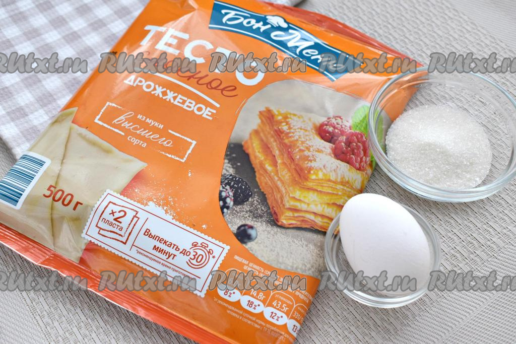 Вот такие продукты я использовала для приготовления язычков с сахаром в аэрогриле. Слоёное тесто можно взять как дрожжевое (именно его я и купила), так и бездрожжевое, его нужно разморозить при комнатной температуре (тесто должно стать мягким).