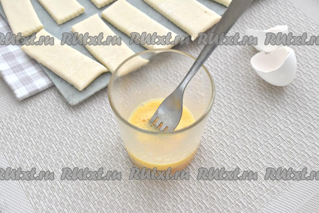 Сверху полоски теста посыпаем сахаром (примерно 2 щепотки сахара на одну полоску).