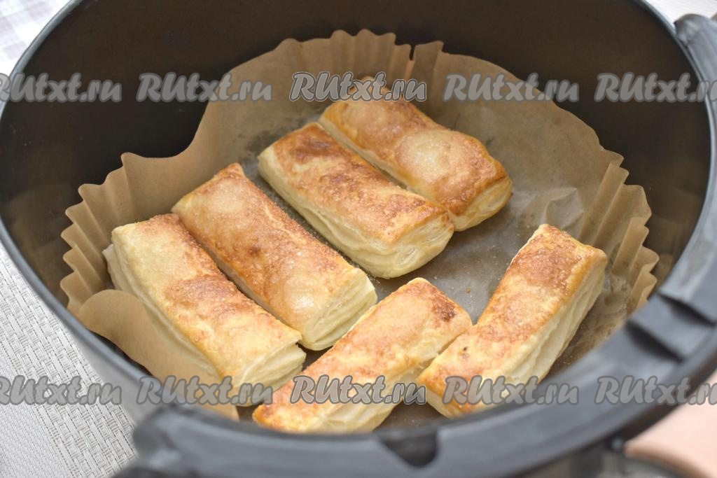 Отправляем чашу с полосками из слоёного теста в аэрогриль. Включаем аэрогриль на 15 минут, температуру устанавливаем на 170 градусов. Я готовила в аэрогриле мощностью 1400 Ватт. Через 8 минут с начала запекания язычки с сахаром нужно перевернуть и продолжить готовить оставшиеся 7 минут. Готовые язычки получаются аппетитными, покрытыми золотистой корочкой.