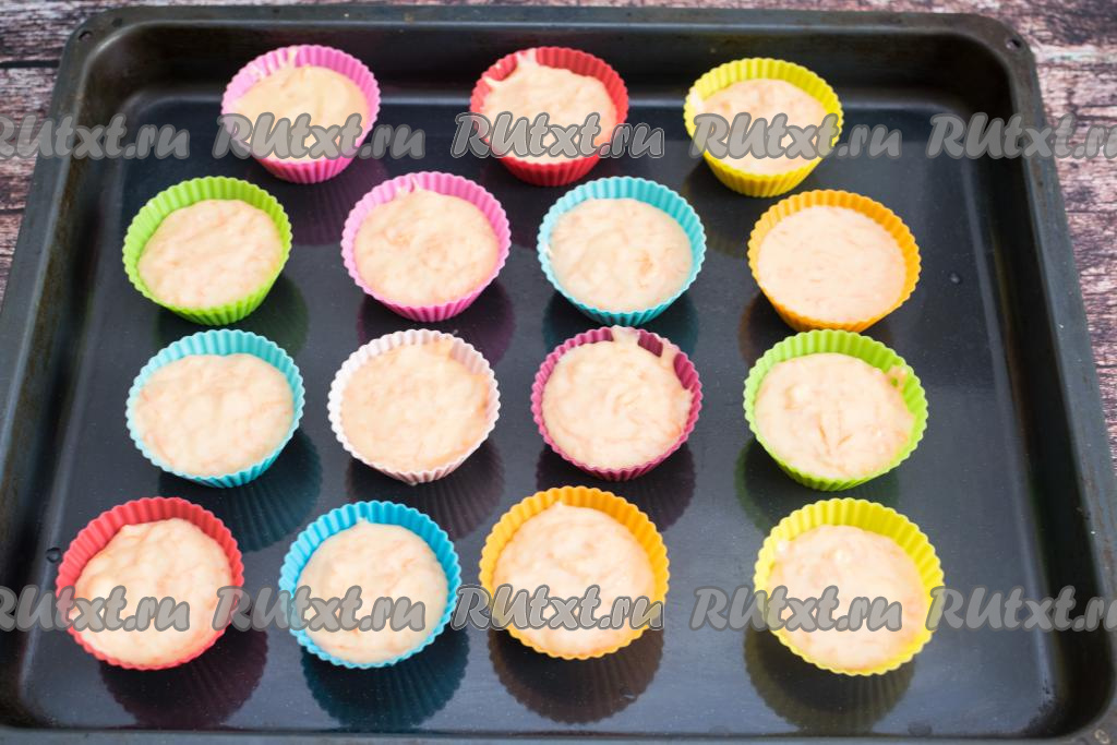 Кексы из морковного теста, замешанного на кефире, я выпекала в силиконовых формочках. Силиконовые формочки я не смазывала маслом перед выкладыванием теста. Формочки для выпечки заполнить морковным тестом примерно на 3/4 объёма. Постановить формочки на противень и отправить в разогретую до 180 градусов духовку.