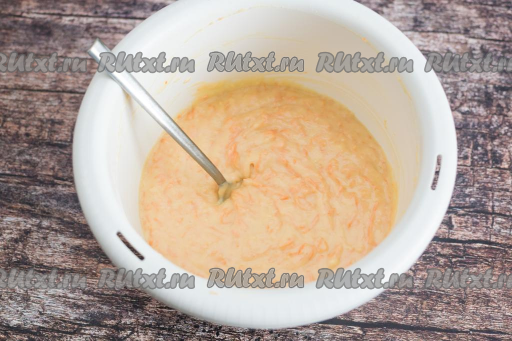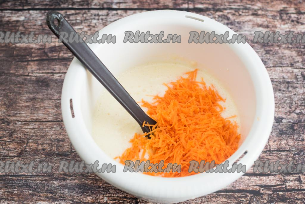 К взбитым яйцам, смешанным с кефиром и маслом, добавить натёртую морковку, аккуратно перемешать лопаткой, равномерно распределяя овощи по яично-кефирной смеси.