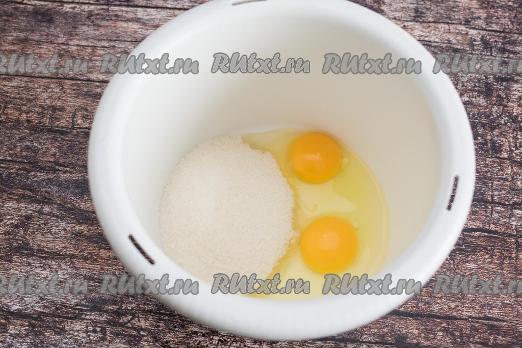 Пока сода гасится в кефире, можно заняться взбиванием яиц. Для этого в чашу для взбивания миксером (или в достаточно глубокую посуду, в которой будет удобно взбивать миксером) нужно всыпать сахар, добавить сырые яйца.