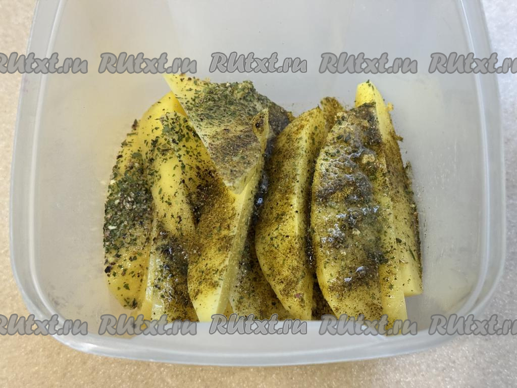 Дольки картофеля поместить в лоток с крышкой, добавить сухие специи и соль по вкусу.