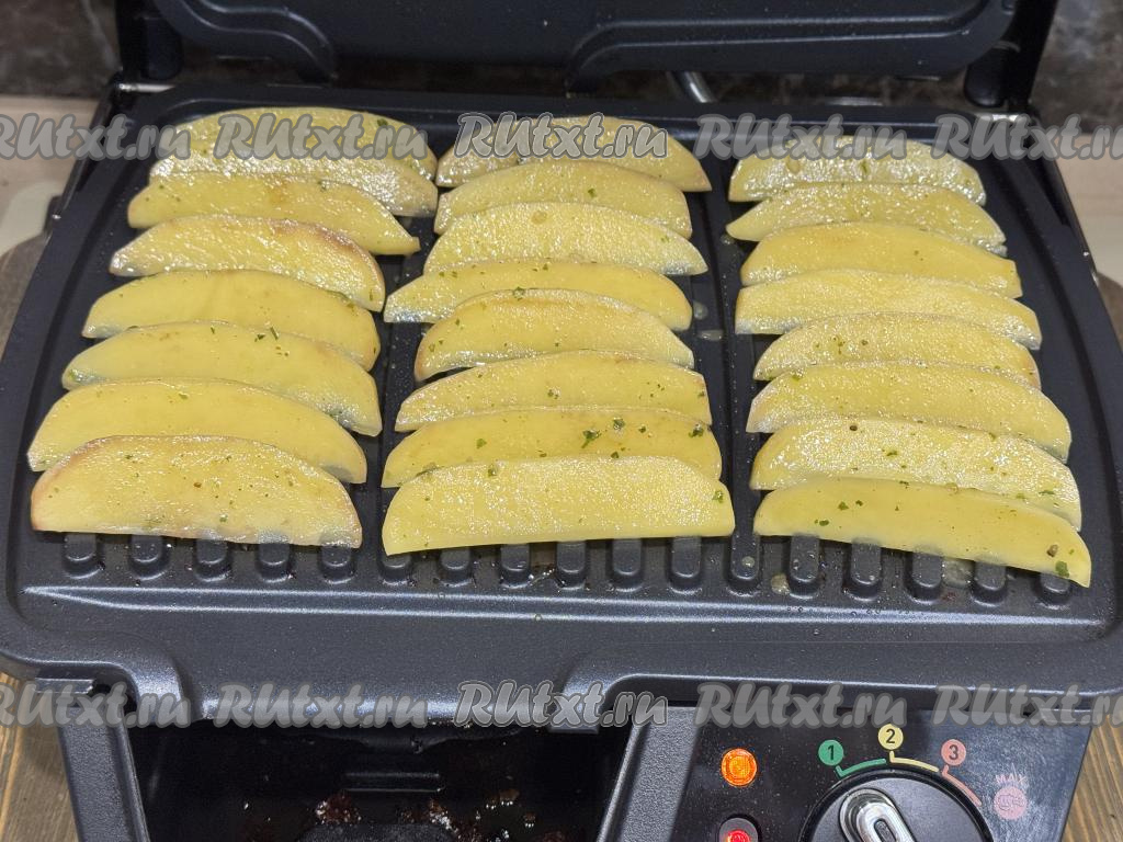 Закрыть створки электрогриля и жарить картофель по-деревенски 25 минут (до готовности). Для того чтобы проверить готовность, нужно проколоть картофель зубочисткой, если прокалывается легко, значит он готов.