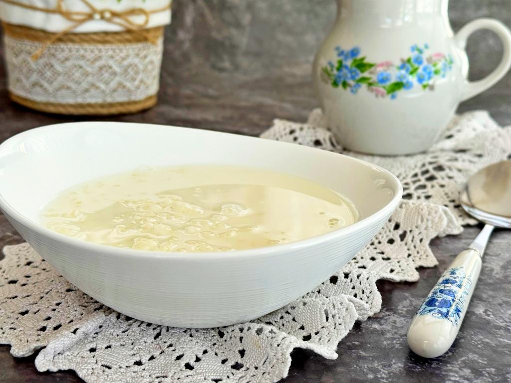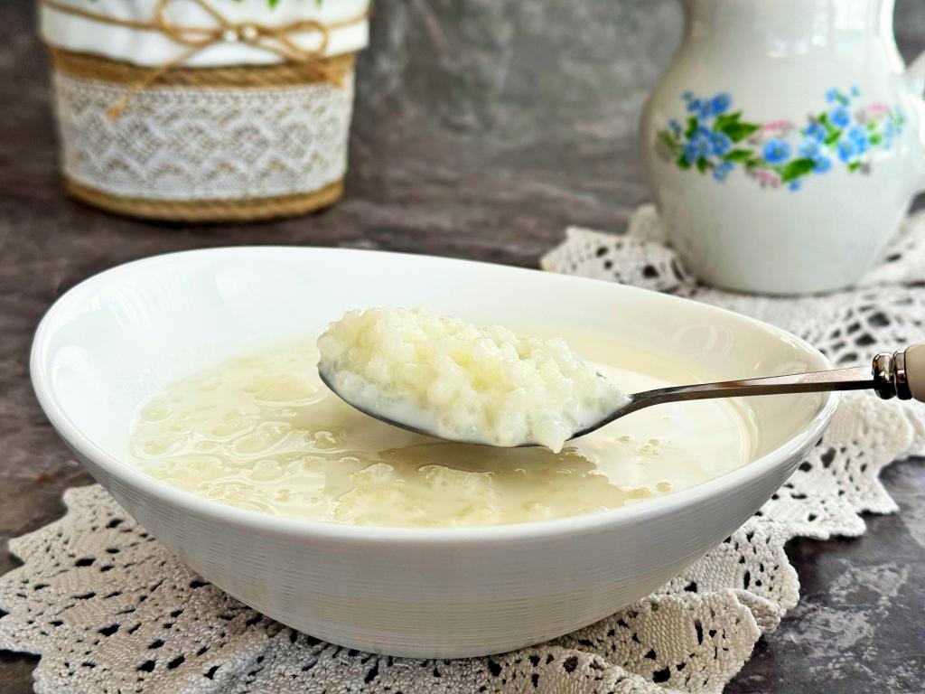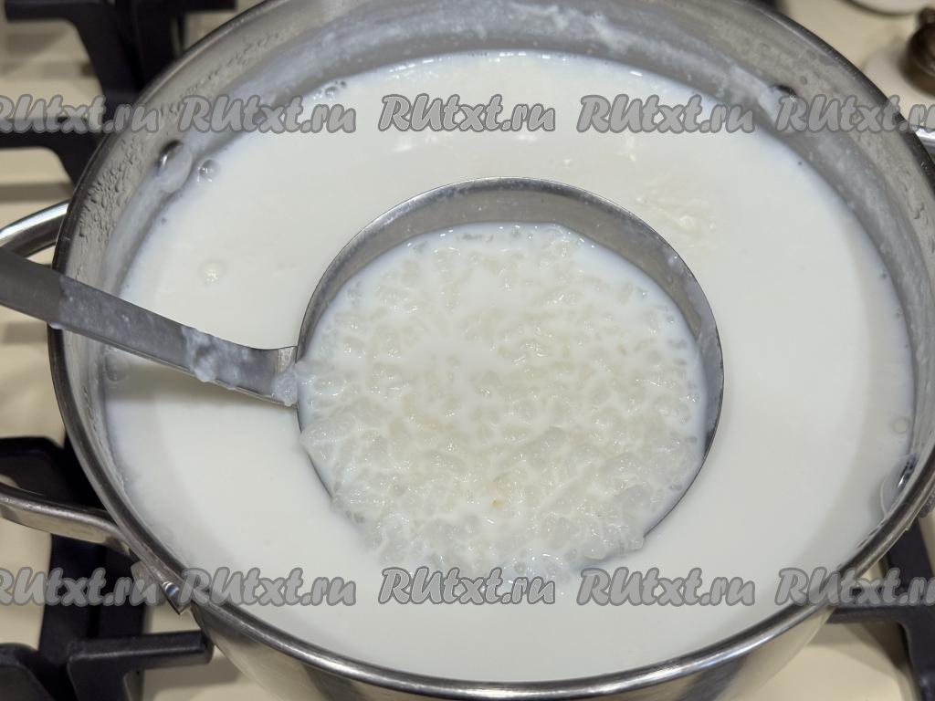 В меру густой молочно-рисовый суп убрать с огня. Рис будет мягким, хорошо разваренным.