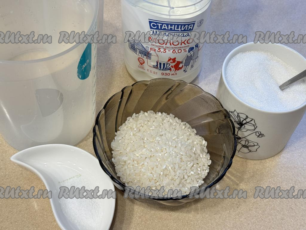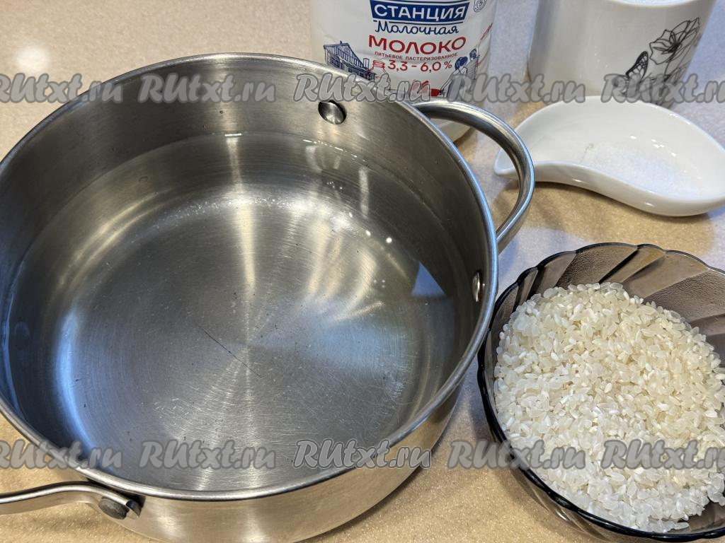 Подготовить продукты. Молоко можно взять любой жирности. Рис выложить в сито, хорошо промыть под проточной водой, затем дать лишней воде стечь.