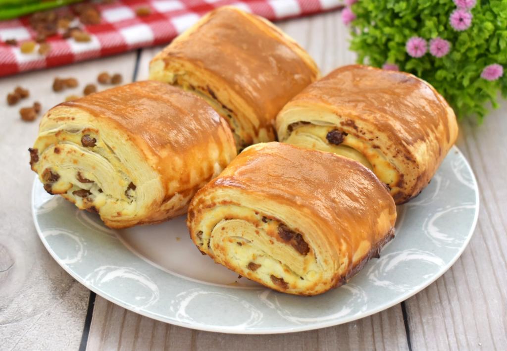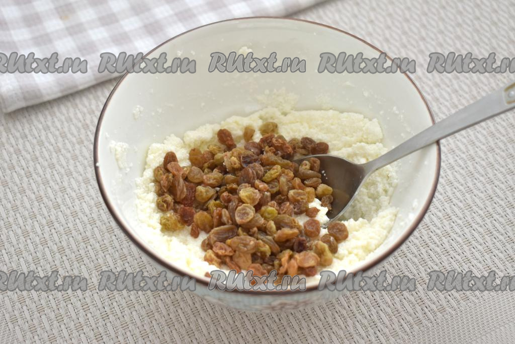 В получившуюся творожную массу добавляем обсушенный изюм, перемешиваем и начинка для слоек готова.