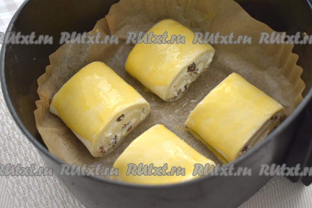 Выставляем температуру аэрогриля на 160 градусов, а время - на 25 минут. Через 15 минут достаём чашу из аэрогриля, слойки с творогом переворачиваем, снова отправляем чашу в аэрогриль, готовим до окончания программы (оставшиеся 10 минут). Готовая выпечка должна стать аппетитного золотистого цвета.
