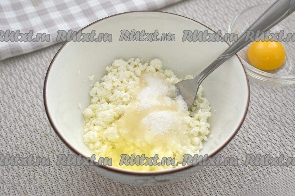 Яйцо разделяем на белок и желток. Желток пока отставляем в сторону (он нам понадобится для смазывания слоек перед выпечкой). В миску выкладываем творог, добавляем яичный белок и сахар, тщательно растираем творожную массу вилкой (до однородности). Творог можно использовать любой жирности (я купила жирностью 5%).