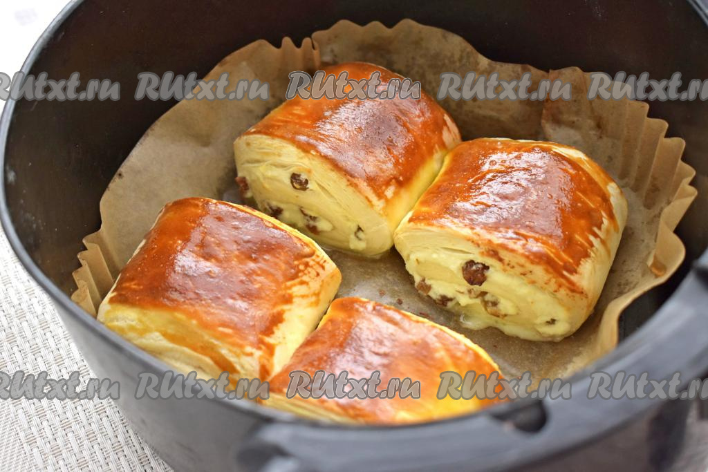 Готовые воздушные слойки с нежной начинкой из творога достаём из аэрогриля и горячими подаём к столу. Кстати, такая выпечка вкусна и в остывшем виде.