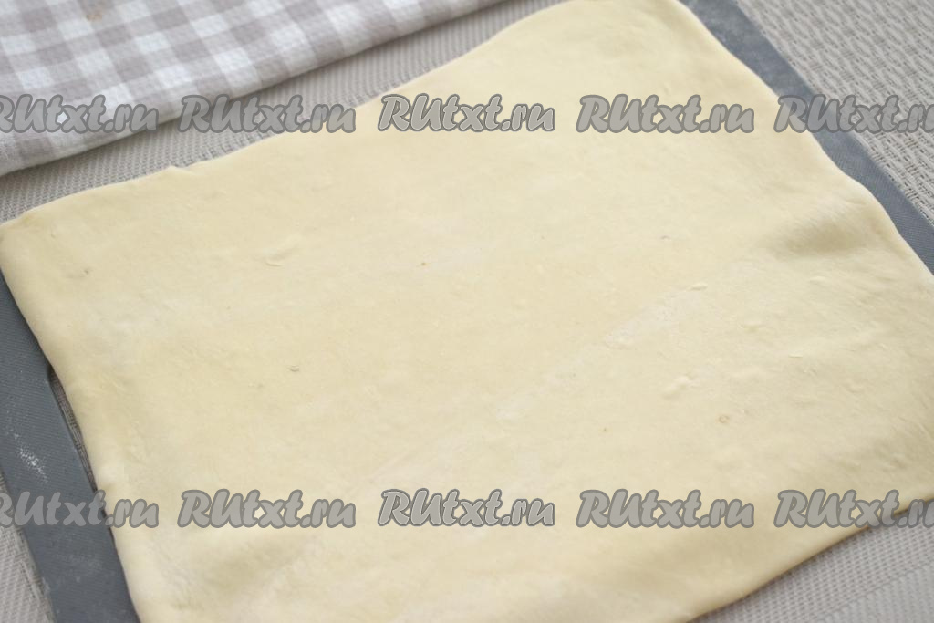 Слегка присыпаем стол мукой, выкладываем размороженное слоёное тесто, раскатываем его в прямоугольный пласт размером 22 сантиметра на 25 сантиметров.