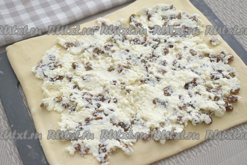 На раскатанное тесто, обступая от краёв по 1 сантиметру, равномерно распределяем творожную начинку.