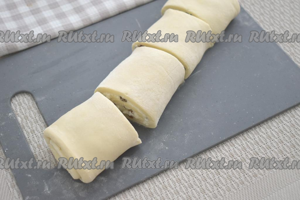Получившийся рулет из слоёного теста с творожной начинкой разрезаем острым ножом на 4 равных части.
