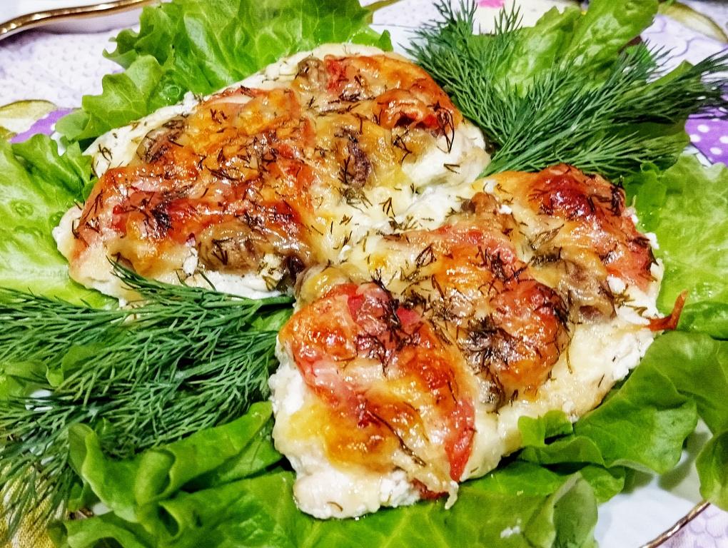 Готовое блюдо достаём из духовки. Аппетитные, вкусные, нежные куриные отбивные, запечённые с грибами и помидорами под сыром, к столу подаём горячими.