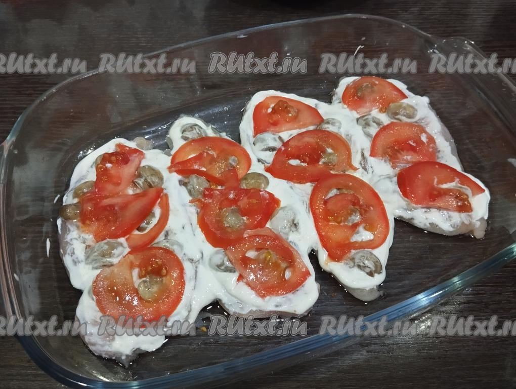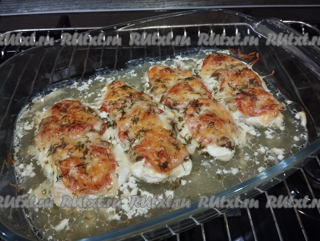 Запекаем куриные отбивные с грибами и помидорами под сыром в духовке, заранее разогретой до 180 градусов, минут 35-40.