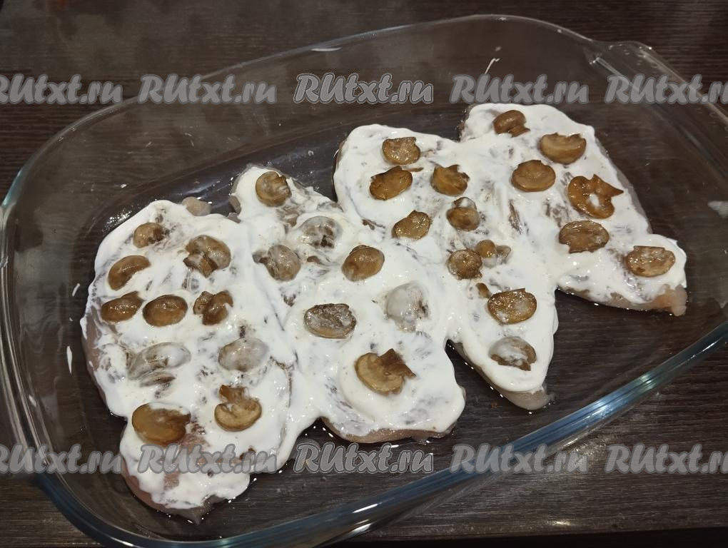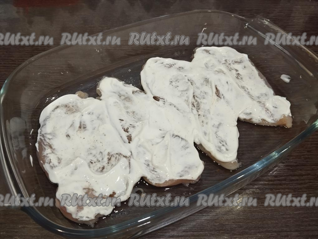 Форму для запекания немного смазываем растительным маслом, выкладываем отбитое куриное филе в один слой, посыпаем солью и специями. Смазываем куриное мясо сметаной.