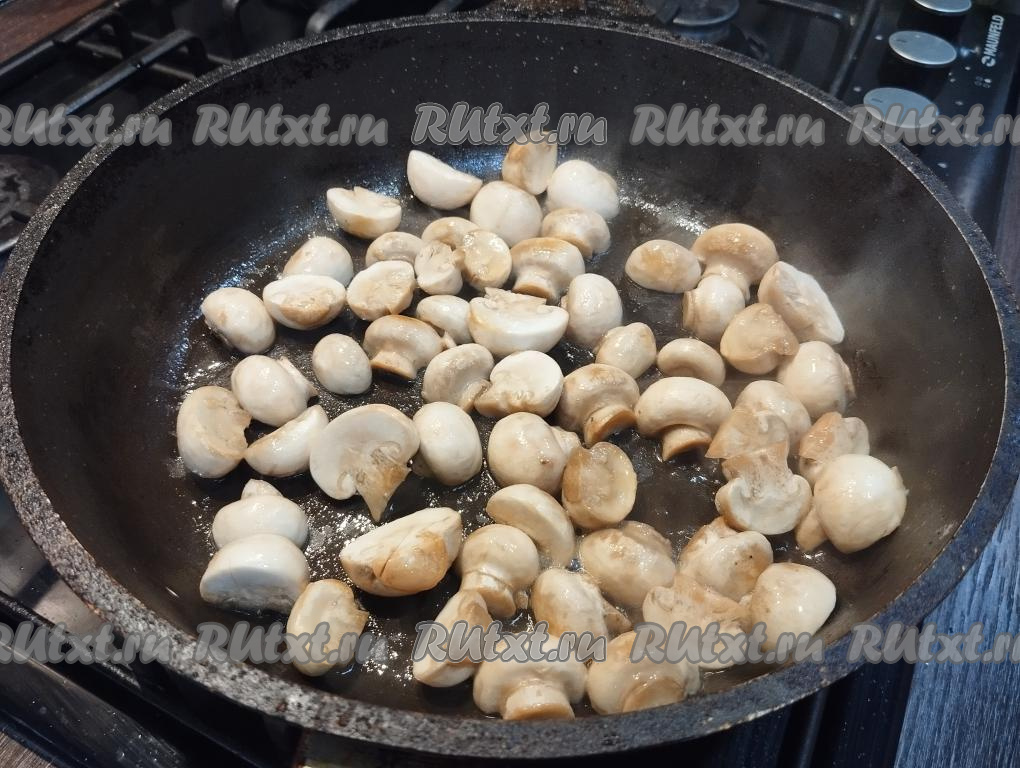 На сковороде разогреваем растительное масло, убавляем огонь до среднего, выкладываем шампиньоны. Обжариваем грибы до слегка золотистого цвета, время от времени помешивая (ориентировочно в течение 6-7 минут). Убираем с огня, даём остыть.