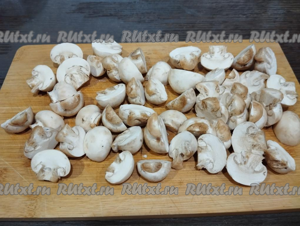 Мелкие шампиньоны, как у меня, разрезаем пополам. Крупные шампиньоны можно нарезать на пластинки.
