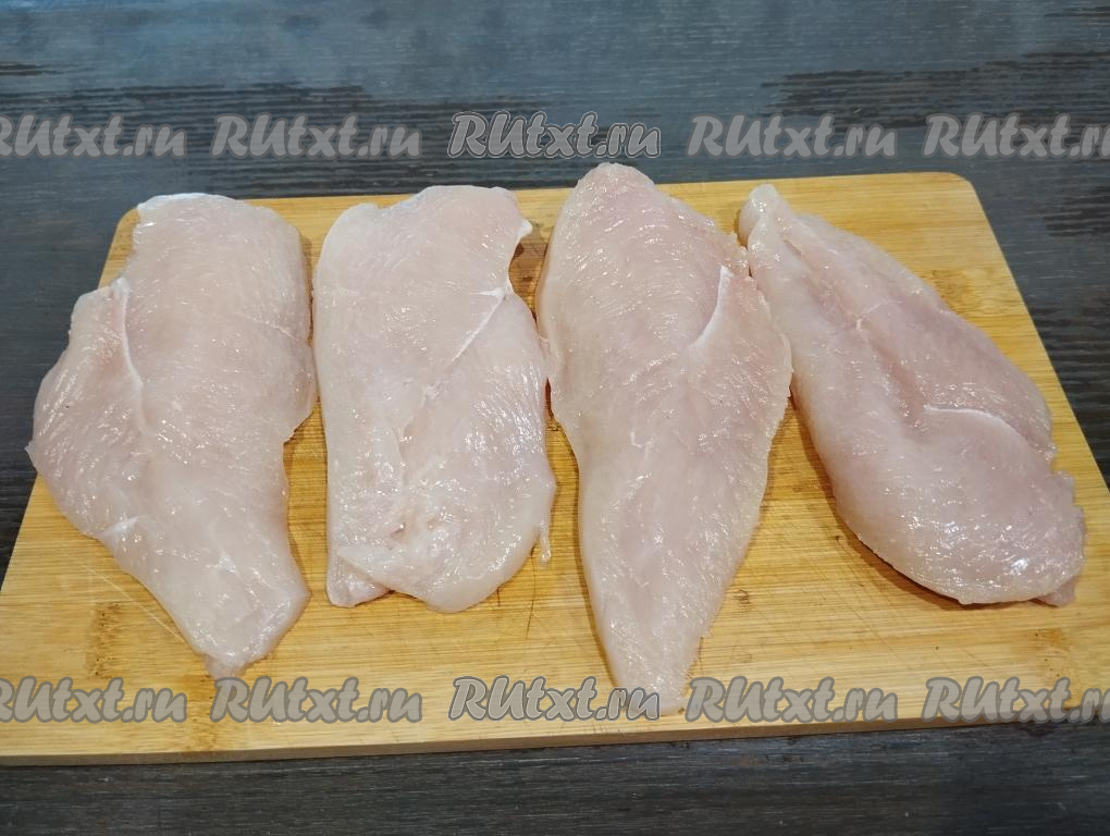 Каждое филе разрезаем вдоль на две части. В результате из 2 куриных филе у нас получатся 4 куска мяса, именно столько отбивных мы и будем готовить. Выкладываем 4 куска мяса на разделочную доску.