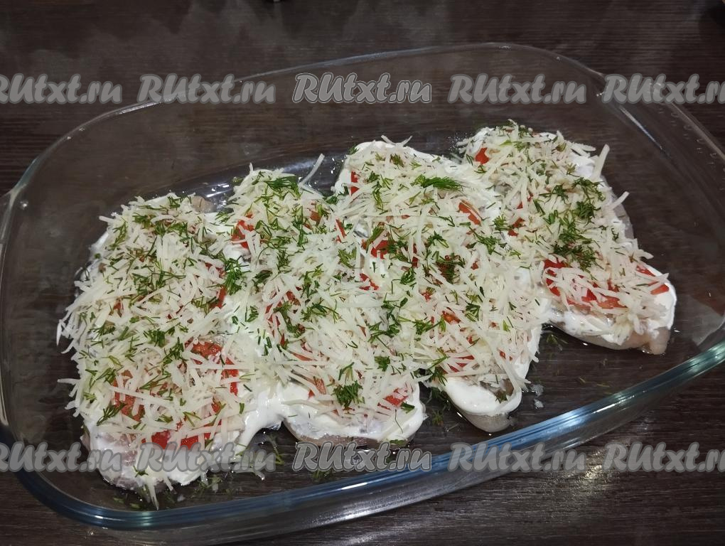 Поверх филе распределяем сыр, натёртый на мелкой тёрке, посыпаем мелко нарезанным укропом.