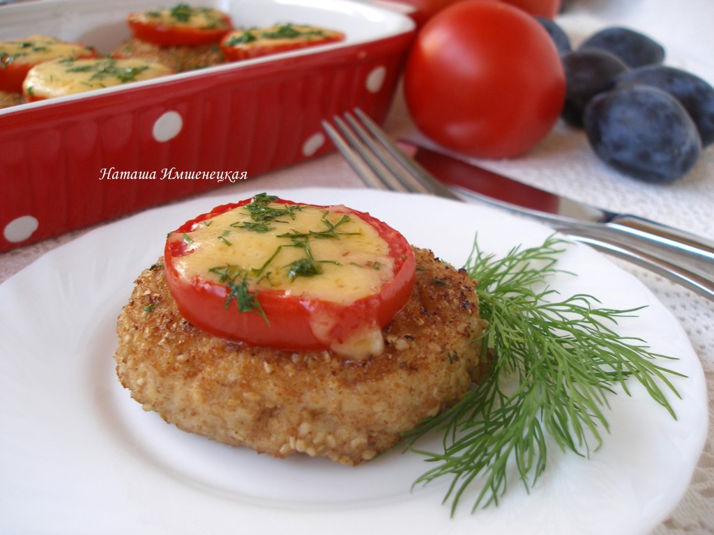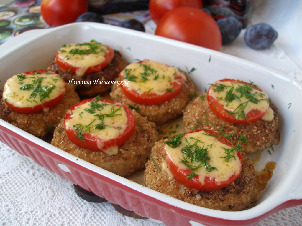 Аппетитнейшие, вкусные котлеты с помидорами и сыром достать из духовки и подать к столу с вашим любимым гарниром.