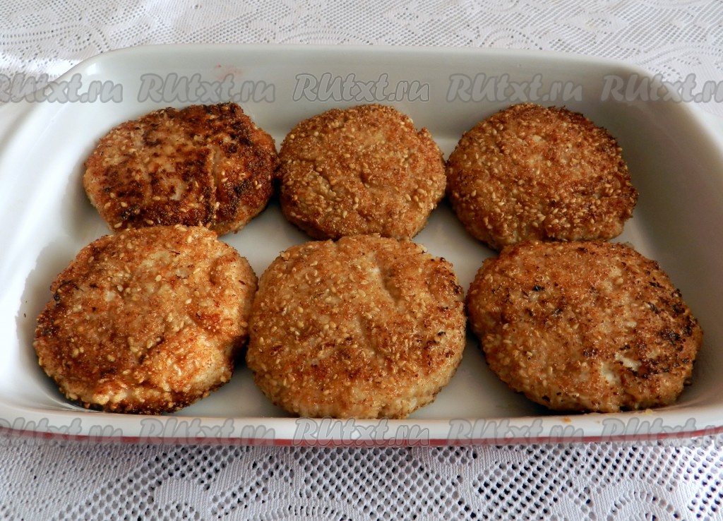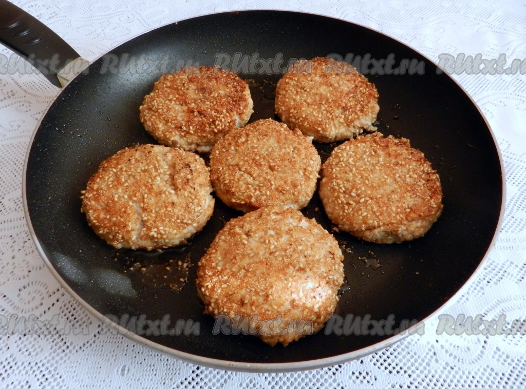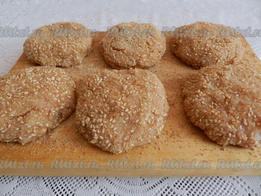 Из фарша сформировать круглые котлеты. Обвалять котлеты в панировочных сухарях. Я добавила в панировку кунжут, но это необязательно.