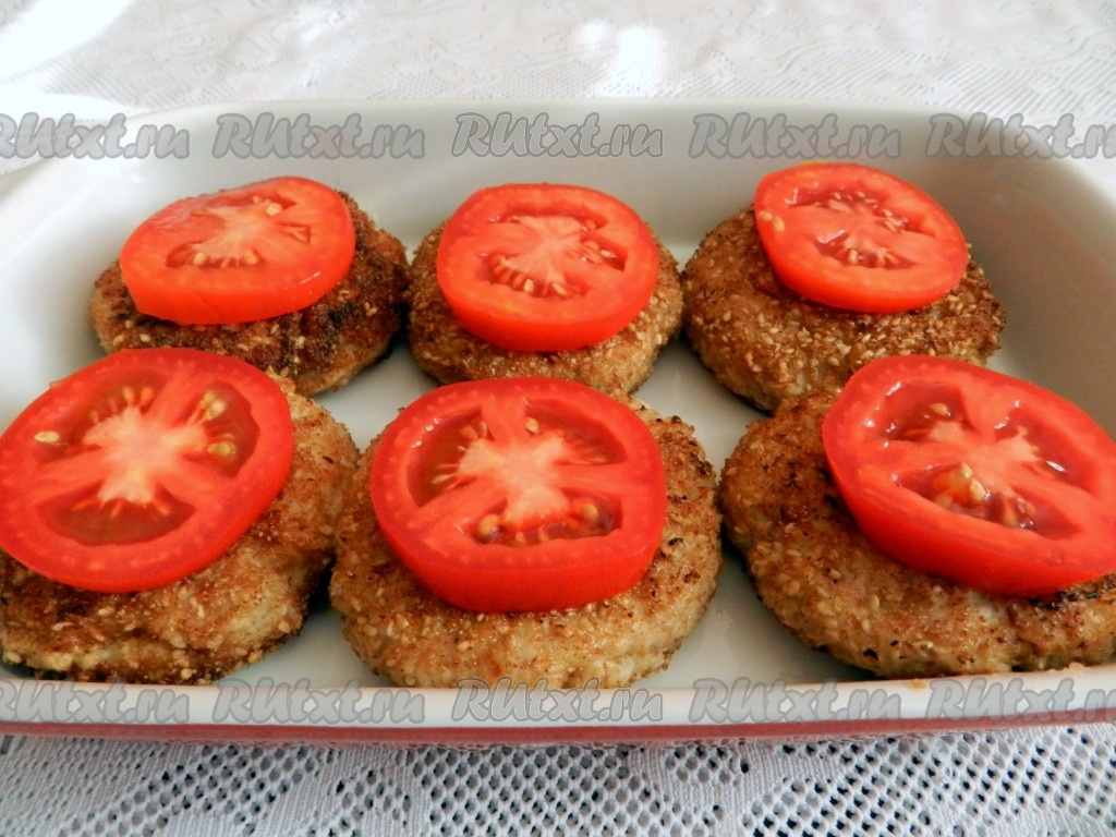 Помидоры нарезать на кружочки и выложить сверху на котлеты. Поставить форму в разогретую до 190 градусов духовку и запекать котлеты с помидорами 20-25 минут.