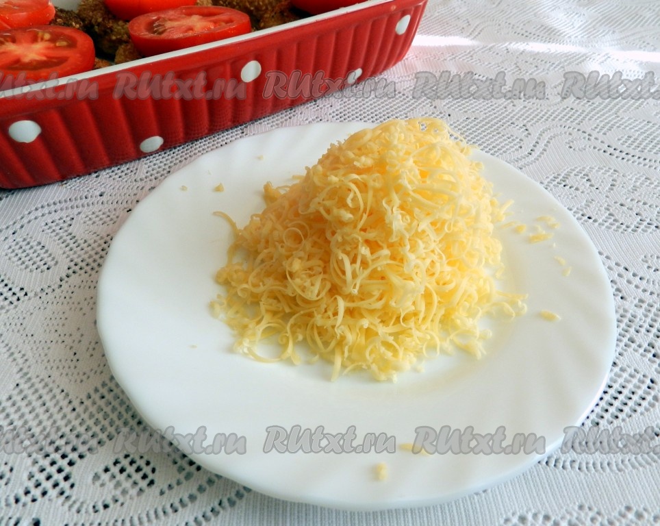 Сыр натереть на мелкой тёрке. Форму с котлетами вынуть из духовки, посыпать сыр сверху помидоров и снова поставить в духовку на 5 минут, чтобы расплавился сыр.