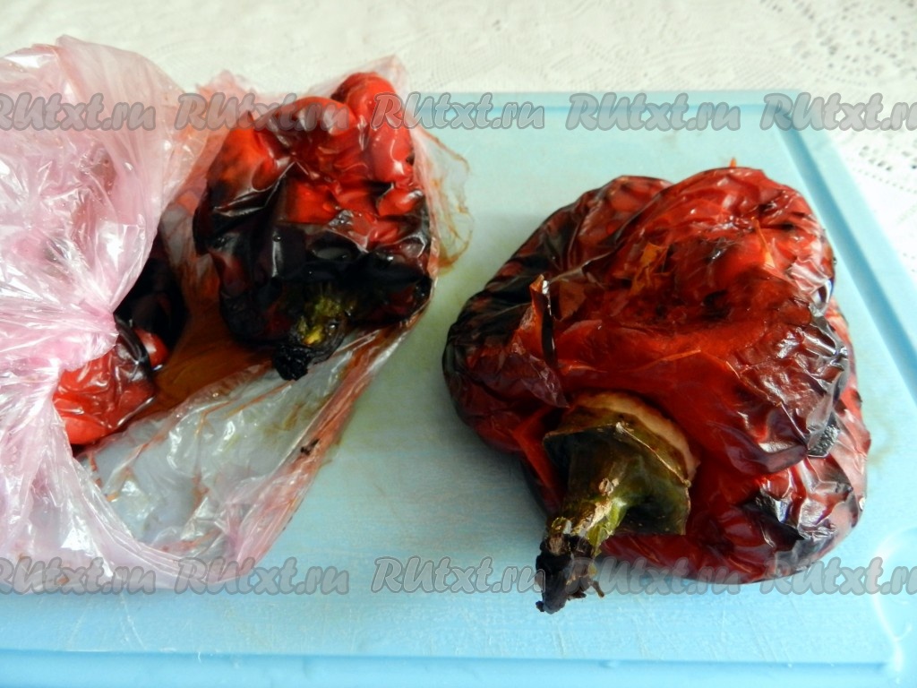 Запеченный перец горячим сложить в чистый полиэтиленовый пакет, плотно завязать и оставить остывать. Когда перец остынет, снять с него кожуру, очистить от косточек.