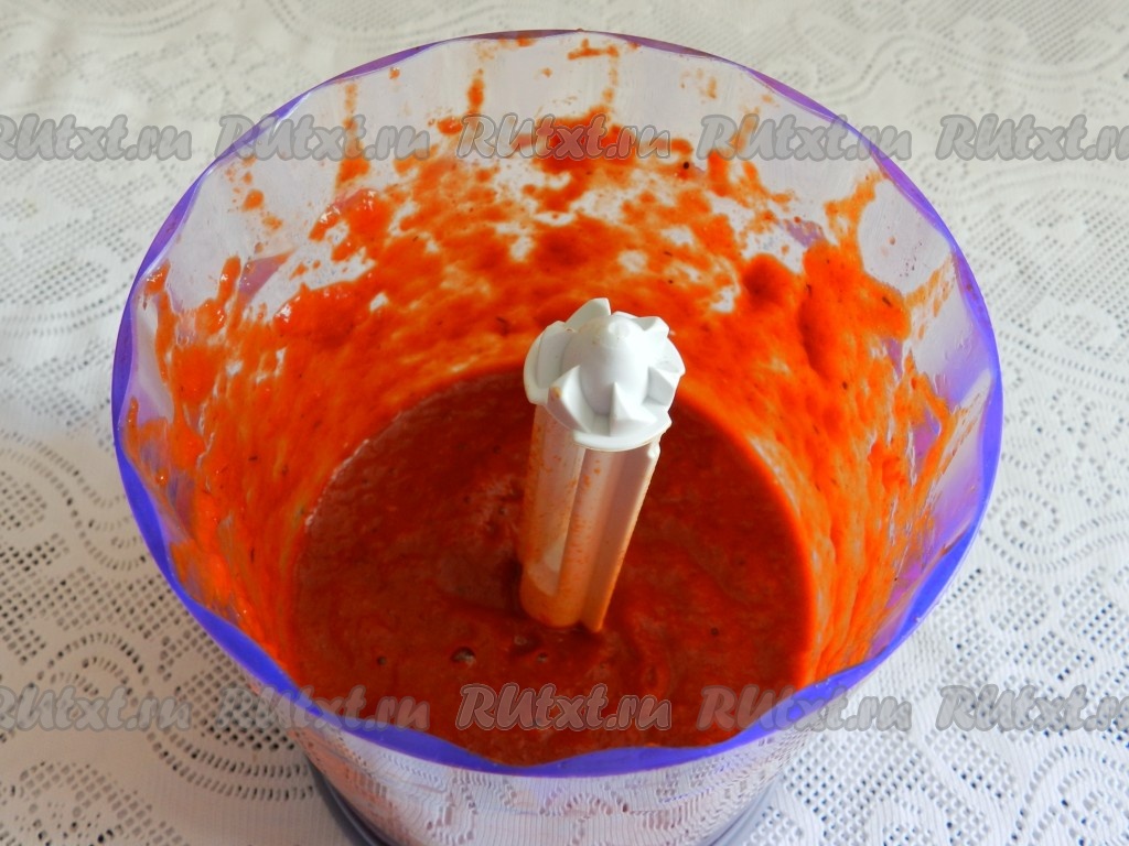 Сложить очищенный перец в блендер, посыпать солью, перцем, молотым кориандром, добавить чеснок, пропущенный через пресс, измельчить все в пюре.