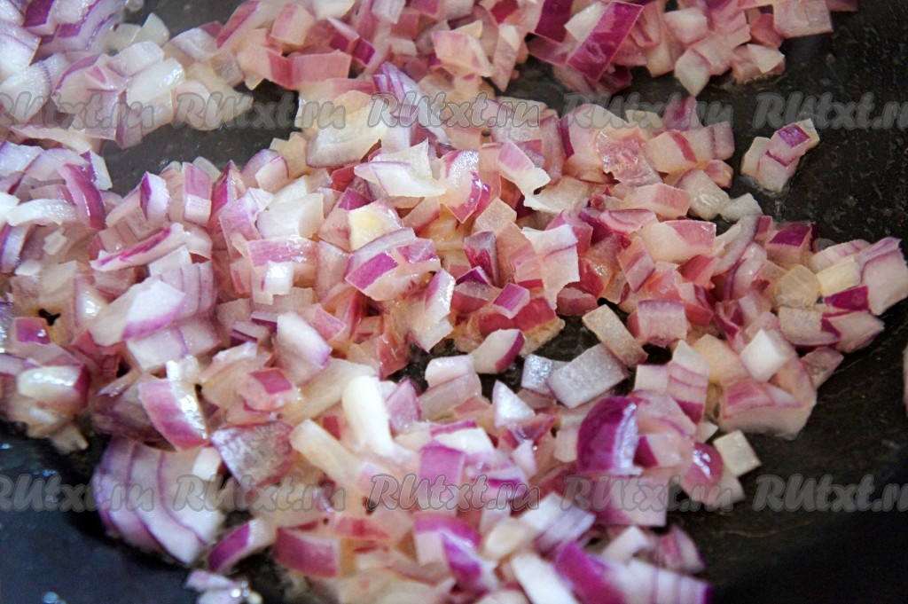 Лук очистить, мелко нарезать. В сковороду выложить сливочное масло и нарезанный лук. Обжарить лук, помешивая, до прозрачности (в течение минут 5) на среднем огне.