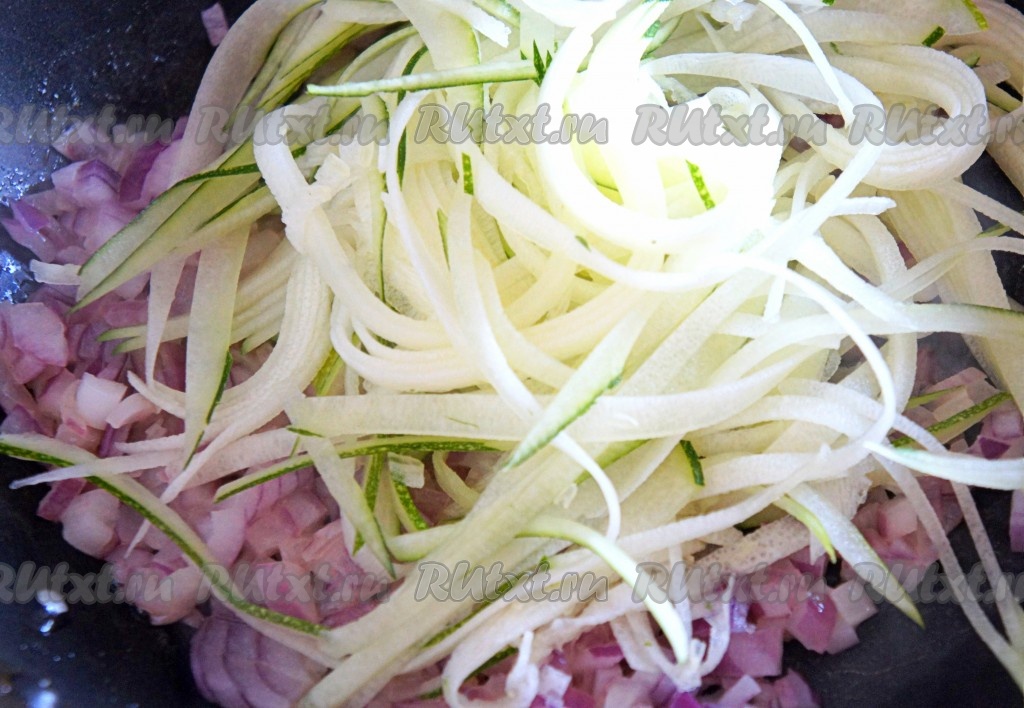 Для этого блюда желательно брать молоденький кабачок с тоненькой кожурой (её можно не срезать). Нарезать кабачок на тонкие полоски с помощью овощечистки, добавить к обжаренному луку, перемешать и готовить, помешивая время от времени, минуты 2-3.