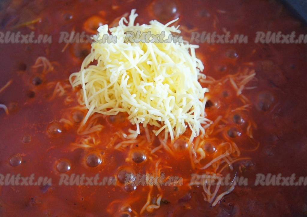 Добавить томатную пасту, влить воду, дать закипеть, всыпать соль, сахар по вкусу, поперчить, перемешать, уменьшить огонь и тушить 1-2 минуты. Затем в получившийся соус выложить натёртый сыр (немного сыра оставьте для подачи), тщательно перемешать, готовить соус для пасты на небольшом огне, пока сыр не расплавится полностью.