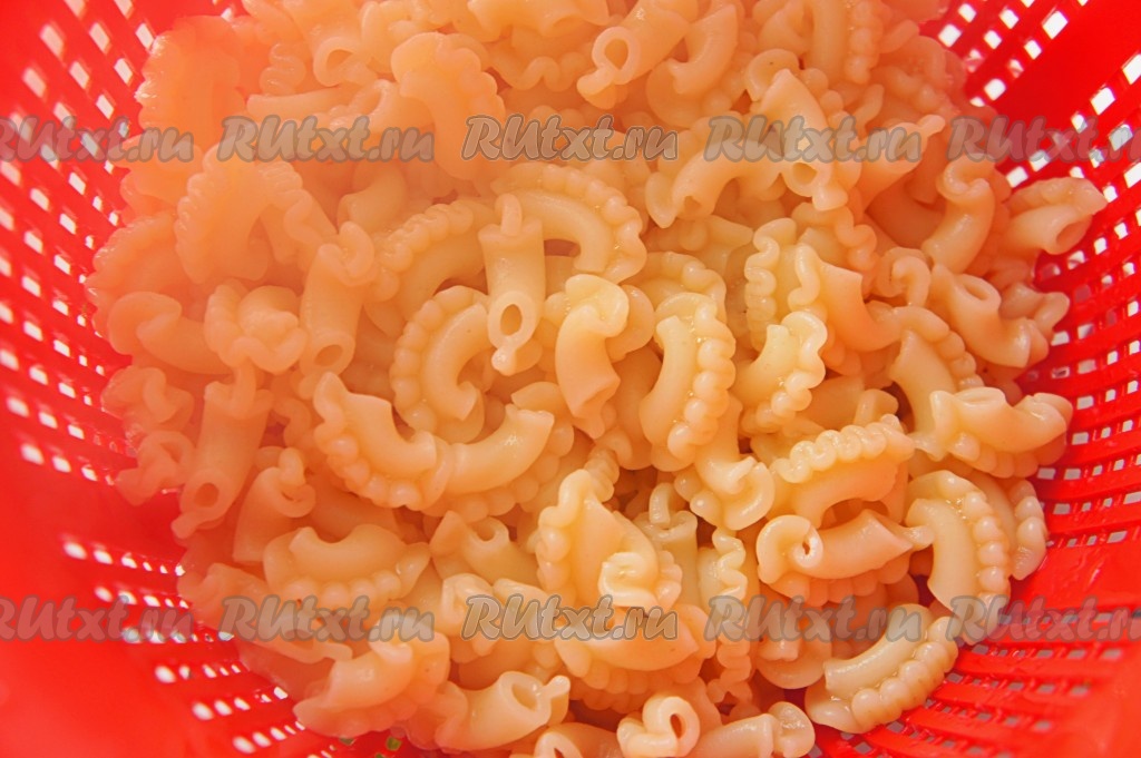 Пасту выложить в кипящую подсоленную воду и отварить в течение времени, указанного на упаковке. Макаронные изделия не должны развариться, они должны остаться достаточно твёрдыми, затем откинуть на дуршлаг и дать стечь воде.