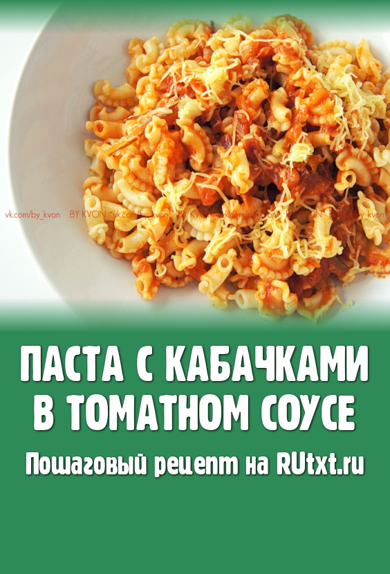 Добавить к отваренной пасте кабачки в томатном соусе, перемешать, посыпать натёртым сыром, разложить по тарелкам и в горячем или тёплом виде подать к столу. Рецепт пасты с овощами прекрасно разнообразит ваше меню.