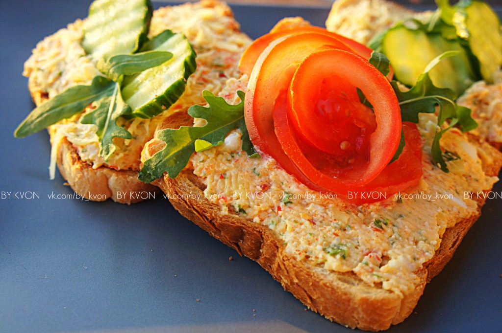 На хлеб щедро намажьте приготовленный домашний паштет из сыра, добавьте зелень и свежие овощи. Получится очень вкусный и сытный бутерброд. При желании, вы можете добавить ветчину, вареную куриную грудку, грибы и т.д. Фантазируйте и экспериментируйте!