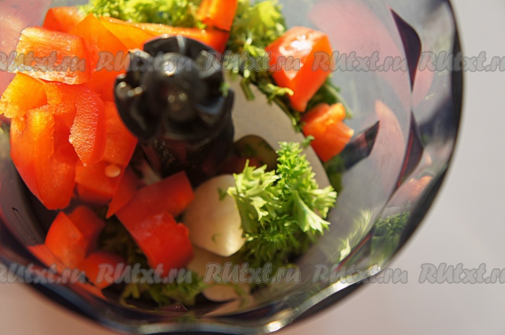Добавить в измельчитель крупно нарезанный красный перец, чеснок, зелень петрушки. При желании можно добавить немного острого перца (я не добавляла). Пробить блендером, но не в кашу, а чтоб оставались аппетитные кусочки.