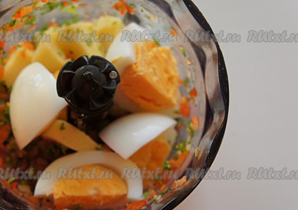 Добавить четвертинки вареных яиц и снова пробить смесь блендером до однородного пастообразного состояния.