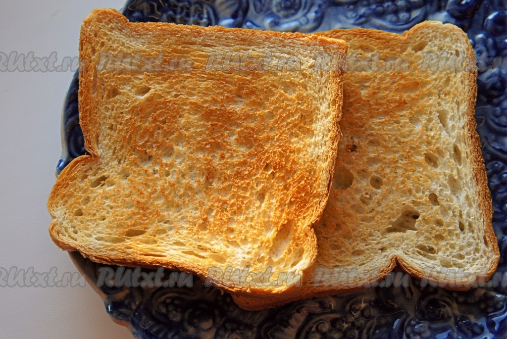Ломтики хлеба подсушить на сковороде или в тостере.