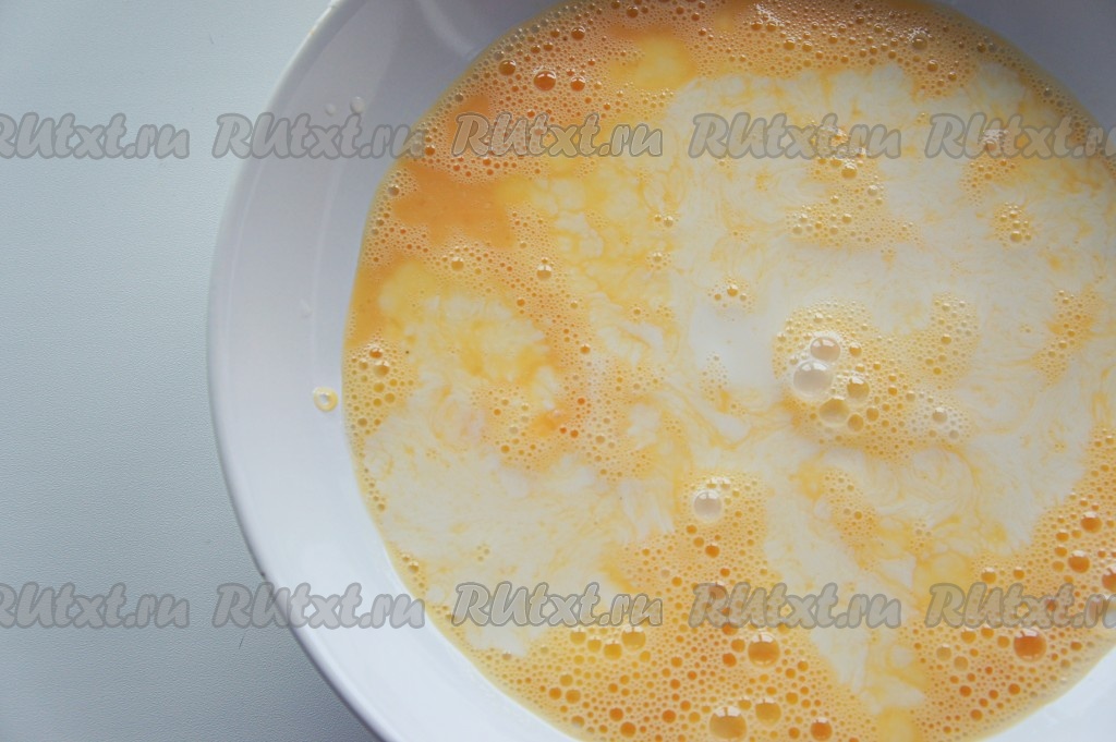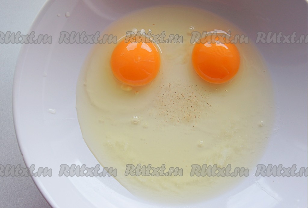К яйцам добавьте ванилин и мускатный орех, взбейте венчиком (или вилкой).