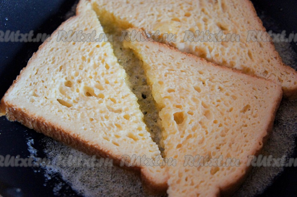 Выложите тосты и поджарьте их на среднем огне до золотистого цвета в карамельном сиропе. В процессе жарки (!) часто переворачивайте кусочки хлеба, так они равномерно "возьмут" весь карамельный сироп и французские тосты будут с приятной, хрустящей сахарной корочкой.