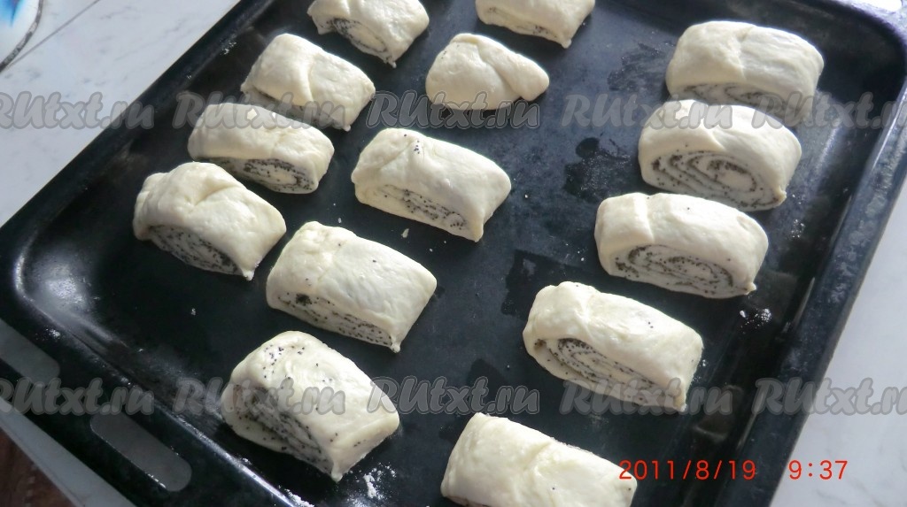 Нарезать маковый рулет поперек на кусочки шириной 4-5 см. Противень смазать растительным маслом и выложить рулетики. Духовку разогреть до 200 градусов. Выпекать рулетики с маком примерно 20-25 минут.