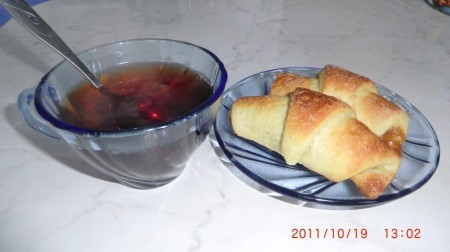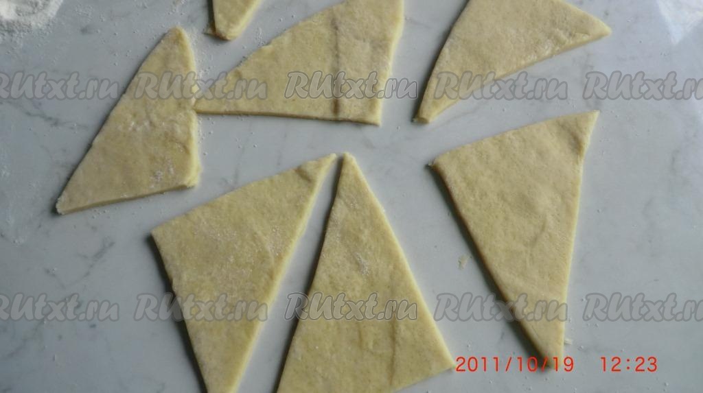 Раскатать их, постоянно припудривая "сахарной мукой". Разрезать тесто на треугольники.