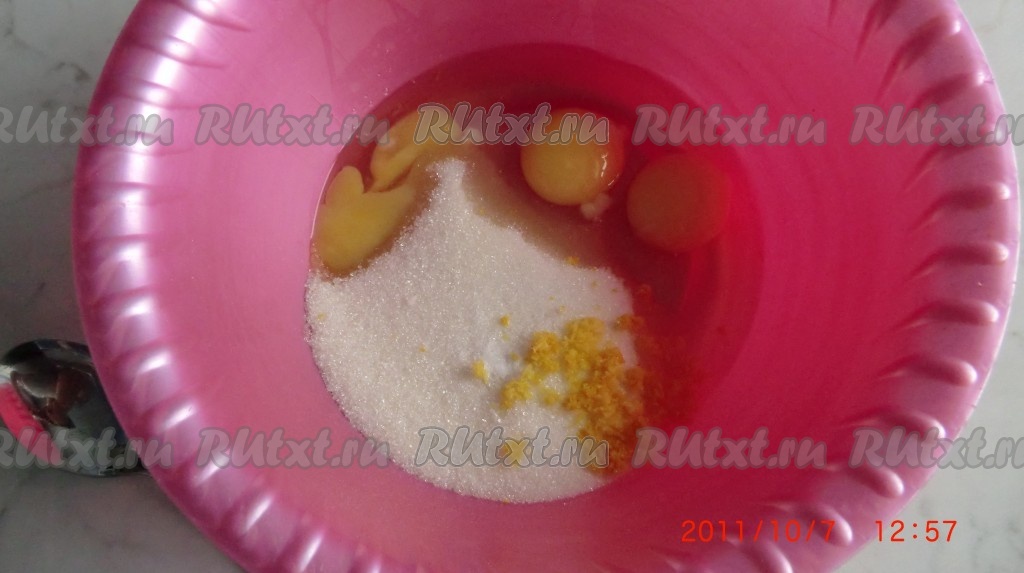 Приготовим тесто для вафель: 3 яйца взбить с 1 стак. сахара, ванилином и цедрой.