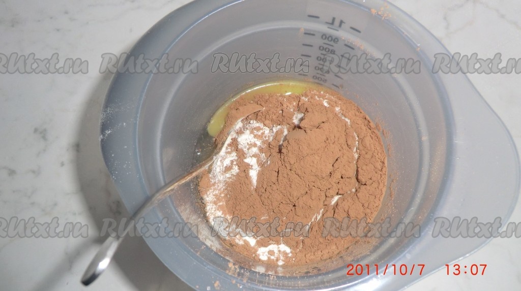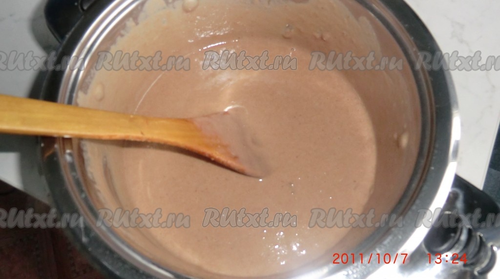 Приготовим крем: 4 яйца, 1,5 стакана сахара, 2 ст. л. муки, 2 ст. л. какао. Всё взбить!