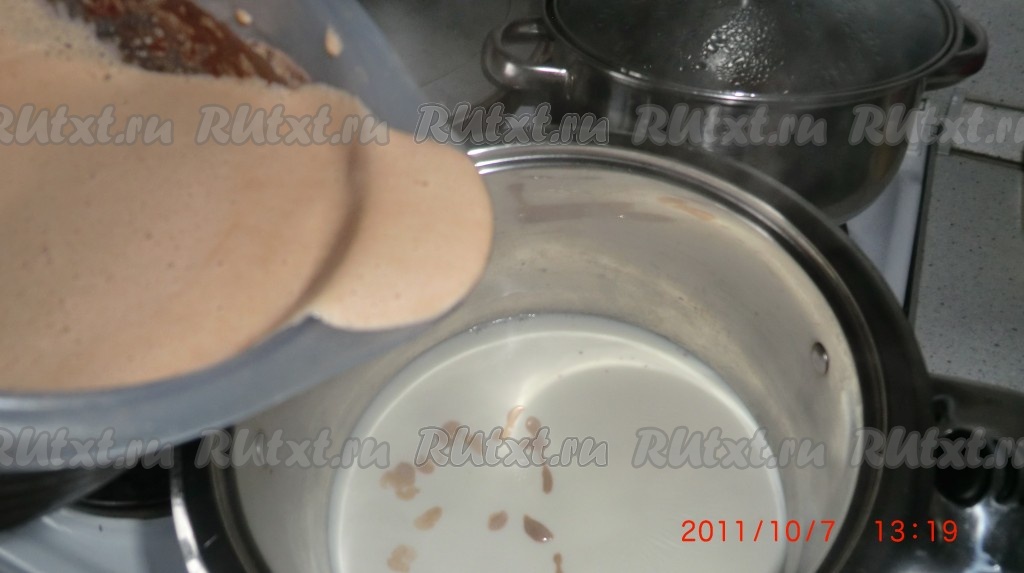 Пол-литра молока прогреть в кастрюле с толстым дном, но не до кипения, до 40*С, примерно. Влить сахарно-яичную смесь в молоко тоненькой струйкой, постоянно помешивая.