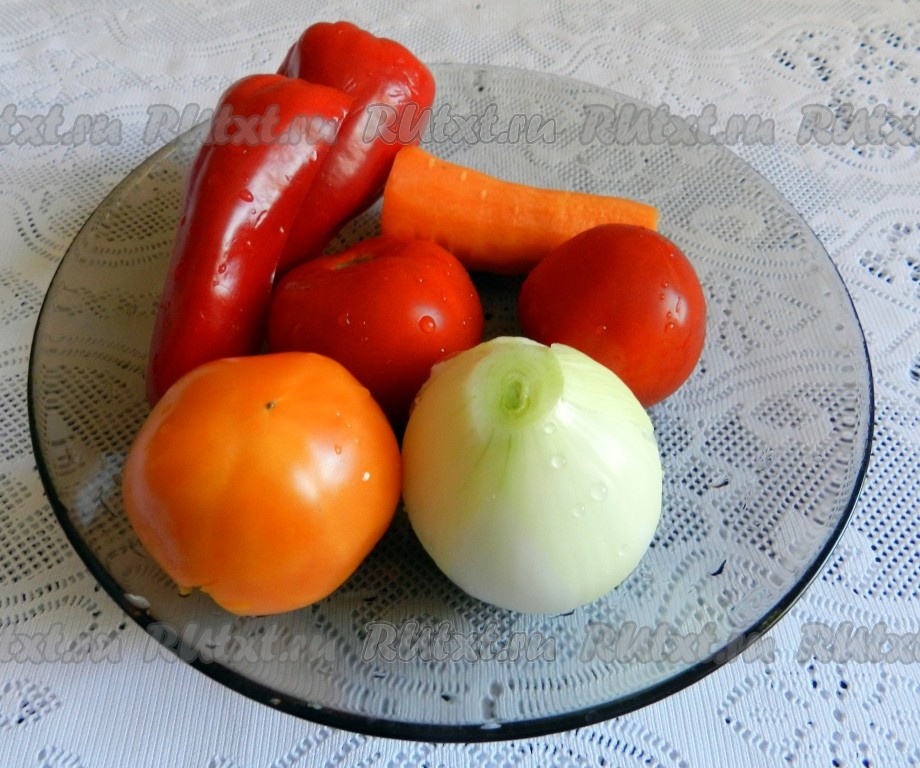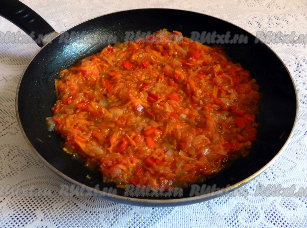 Добавить нарезанные болгарский перец и помидоры, очищенные от кожуры. Посолить, поперчить, добавить молотую паприку и обжарить все вместе 3-4 минуты. Заправка для супа из индейки с овощами готова.