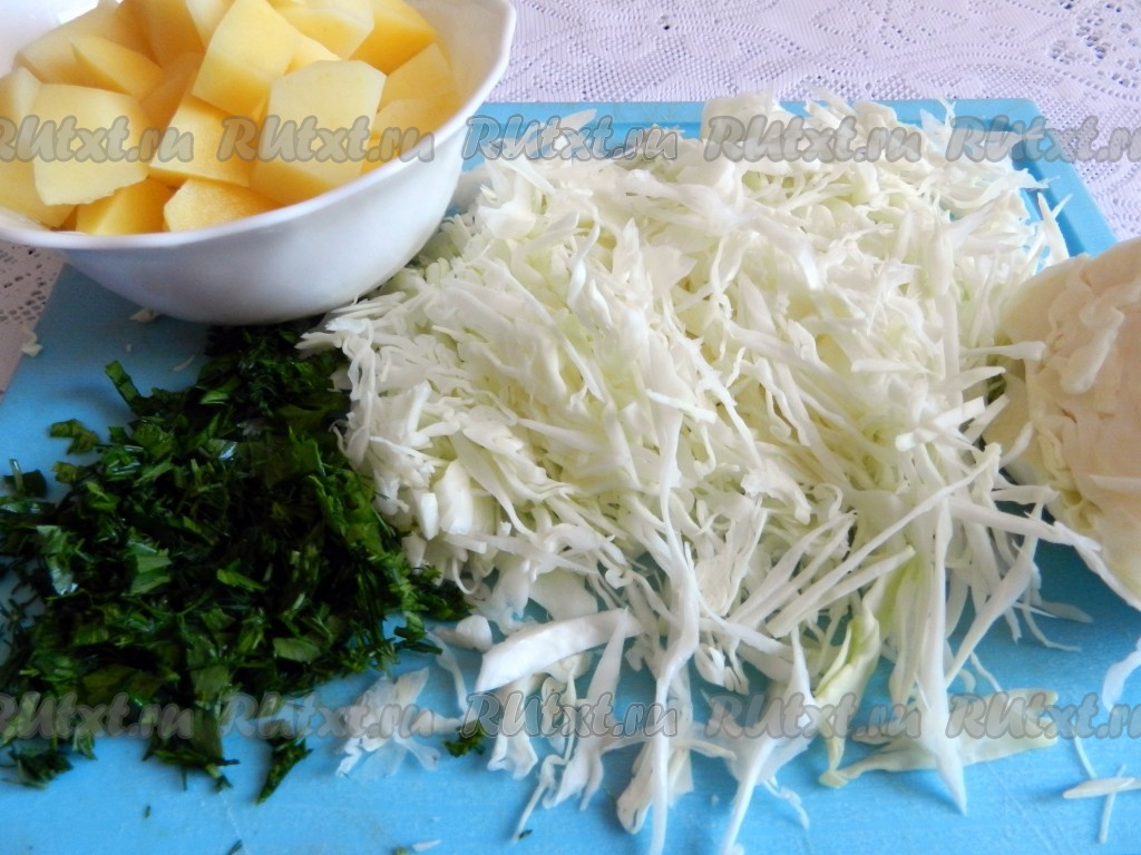 Картофель очистить и нарезать кубиками. Капусту нарезать соломкой. Мелко нарезать свежую зелень.