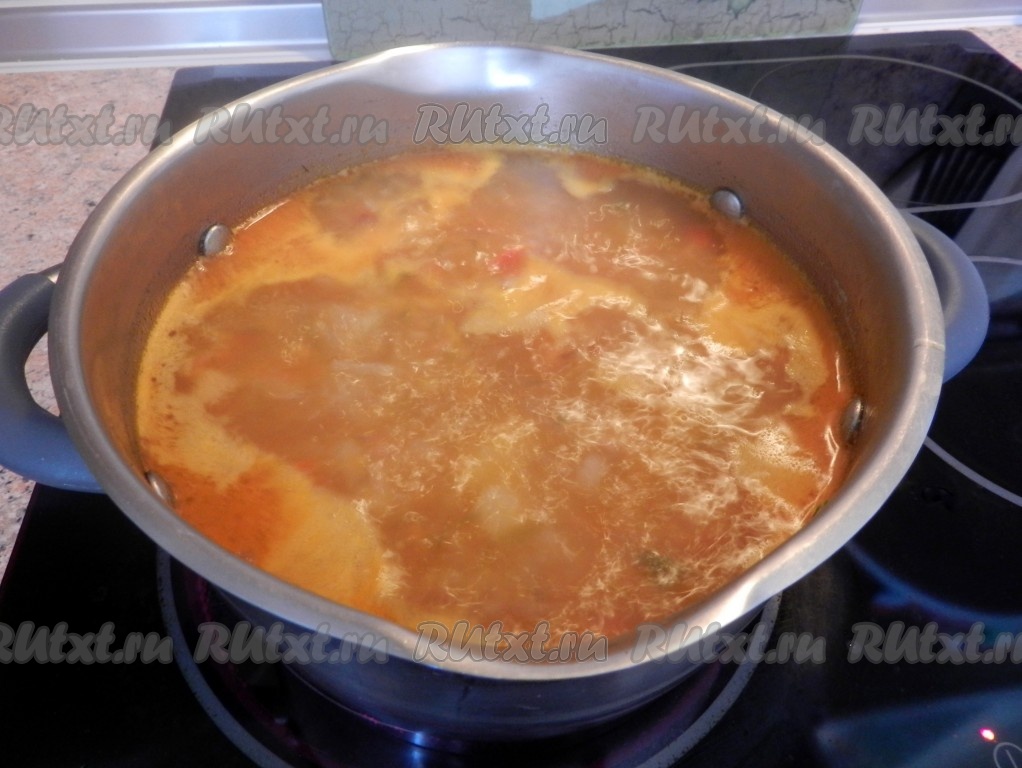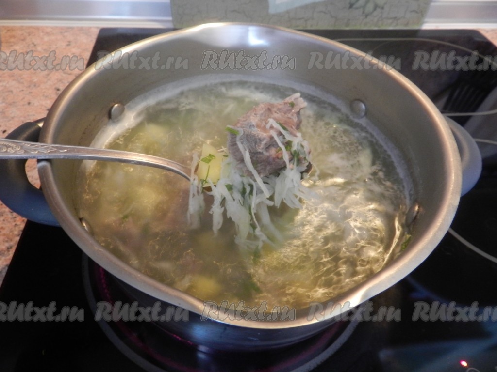 Бульон довести до кипения, положить в него картошку, капусту, мясо индейки, уменьшить огонь и варить суп до готовности картошки.