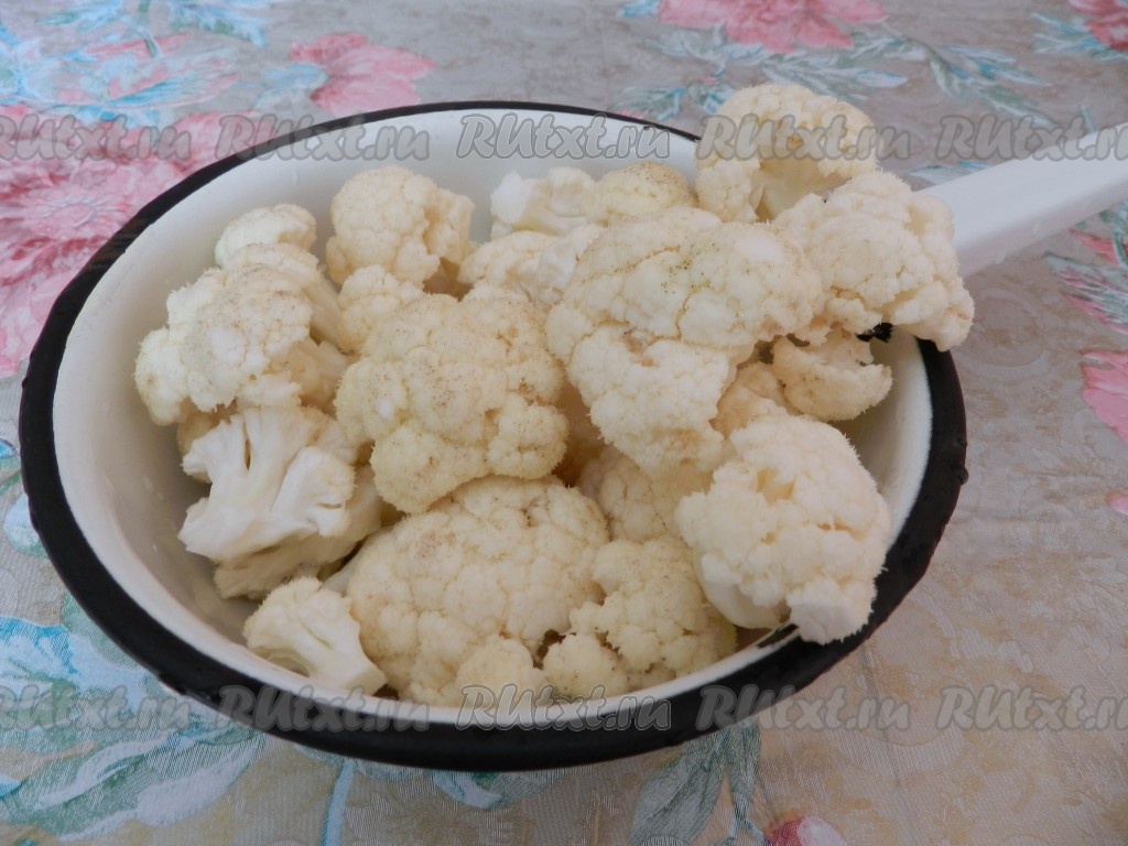 Цветную капусту вымыть, разобрать на соцветия, как на фото. Отварить в кипящей подсоленной воде 3 минуты. Откинуть капусту на дуршлаг, чтобы стекла вода.